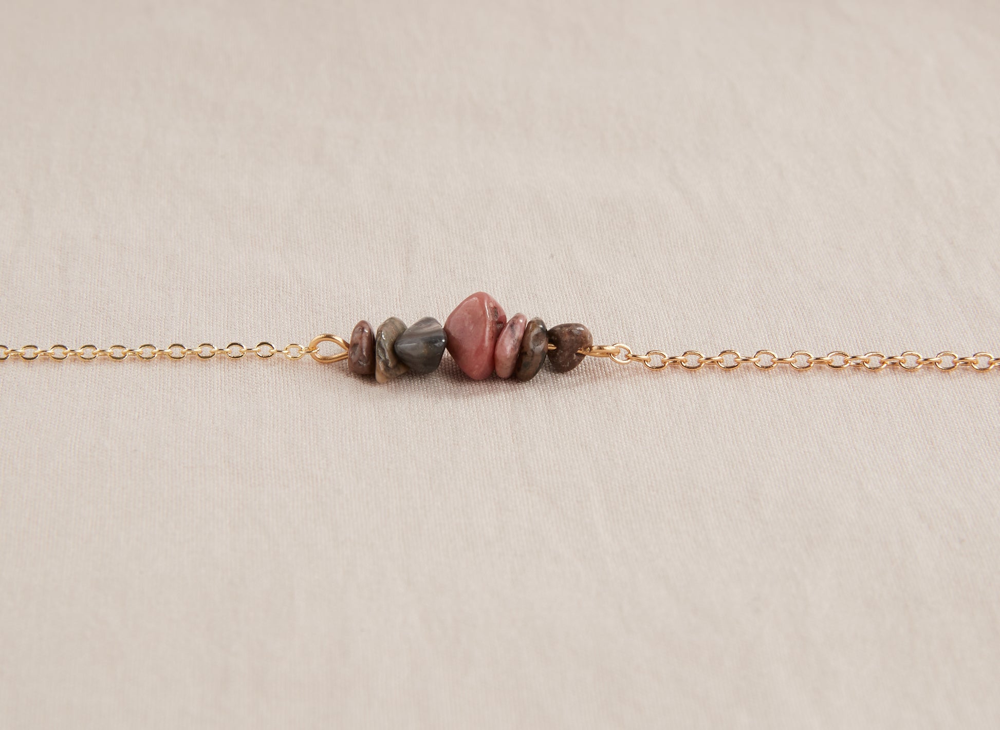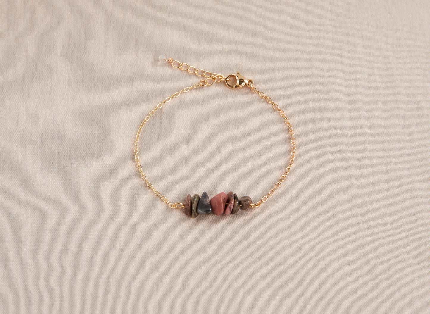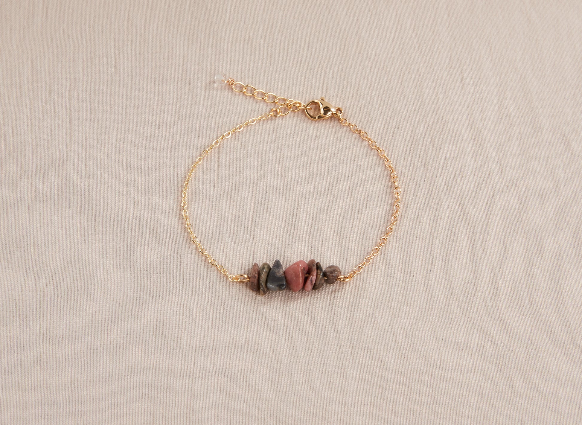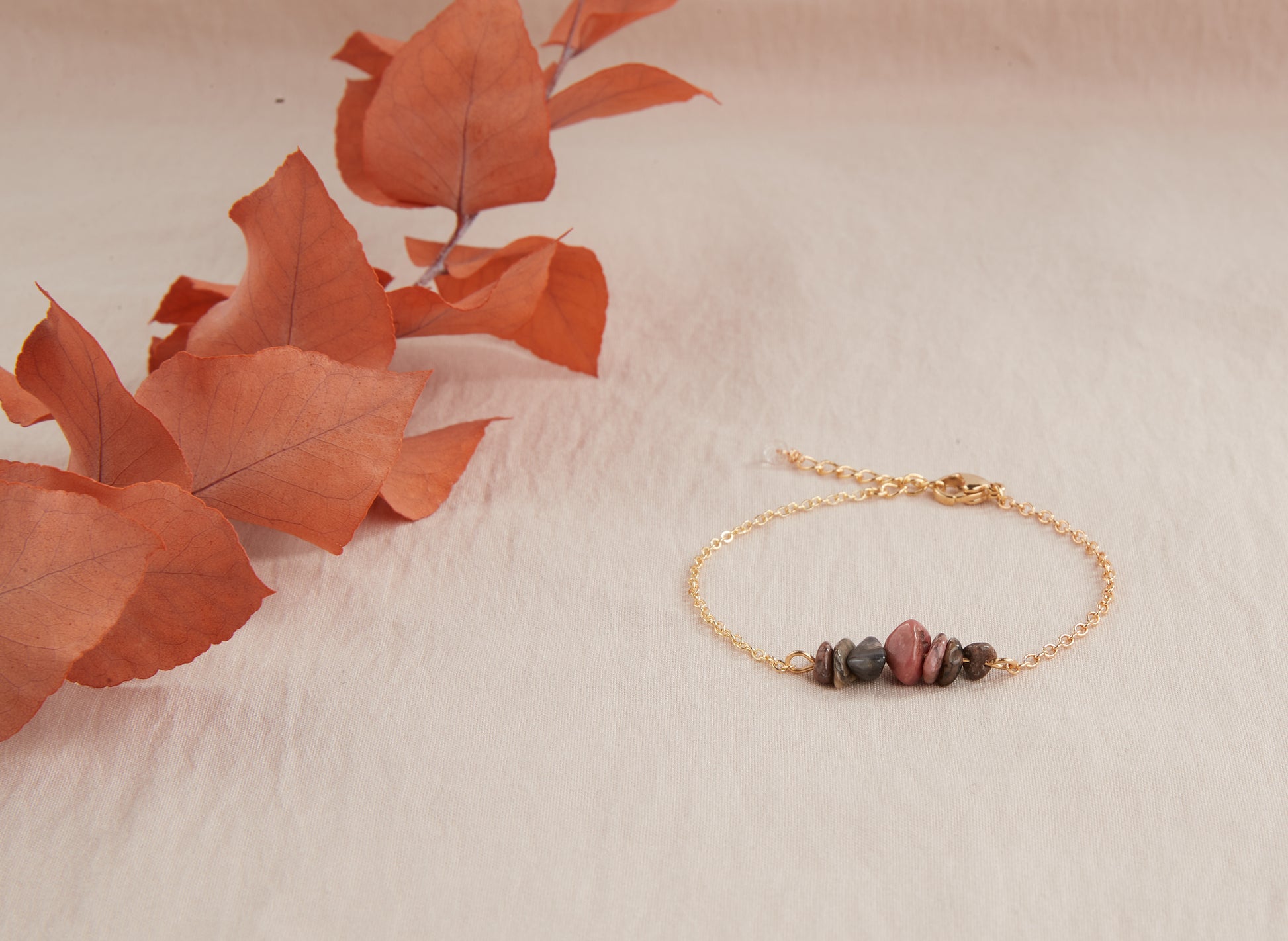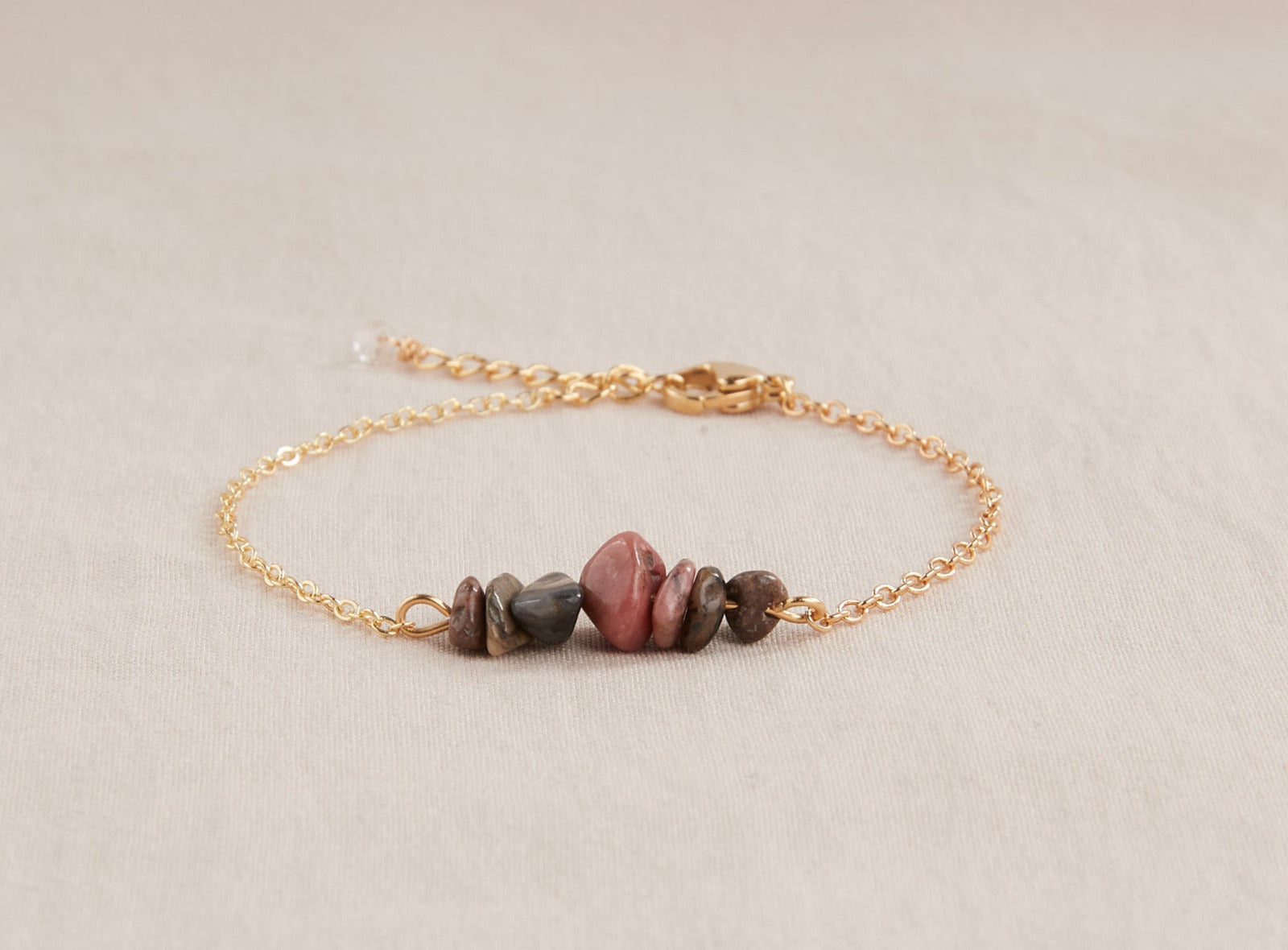 Bracelet fin composé d'une chaînette dorée en acier inoxydable et de 5 pierres rhodonite de différentes teintes entre rose et marron.
